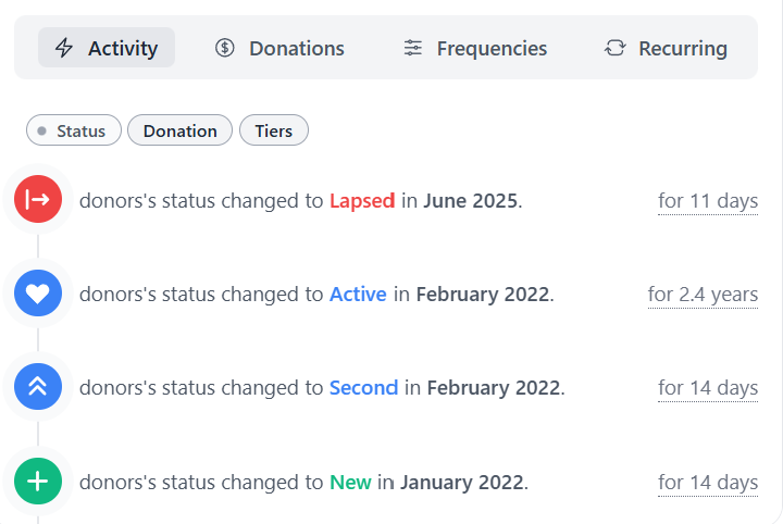 Sometimes, it's nice to know, though. Not only can you easily spot increases or decreases in gifts, you can also spot giving over time changes with donor tiers.